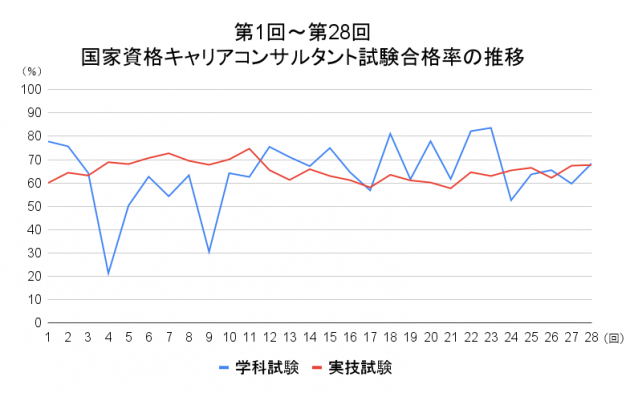 国家資格キャリアコンサルタントは学科試験と実技試験があり、それぞれの合格率が公開されています。