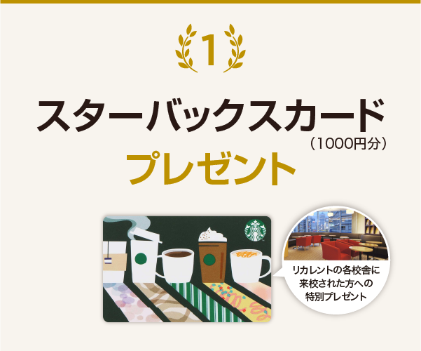 期間中にリカレントの校舎に来校し、「個別ガイダンス」または「セミナー/説明会」に参加された方全員に「スターバックスカード(1000円分)」をプレゼントいたします。