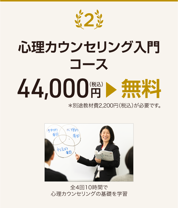 期間中にリカレントのパックコースに入会された方全員に、心理の基礎を学べる、心理カウンセリング入門コース(全4回・10時間)をプレゼント。