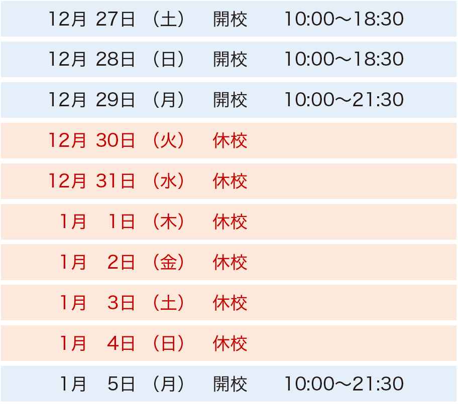 2025年12月30日(火)~2026年1月4日(日)は休校となります。それ以外の日程は、平常通り開校しています。